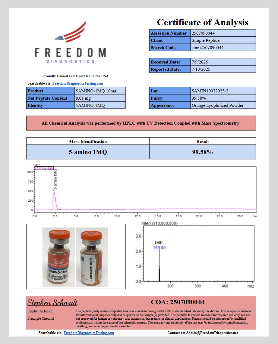 5-Amino-1MQ arrives as a stable, dry powder designed for laboratory use. Before testing, researchers dissolve the powder into a liquid using standard lab methods. Proper handling helps preserve quality and consistency throughout the study.