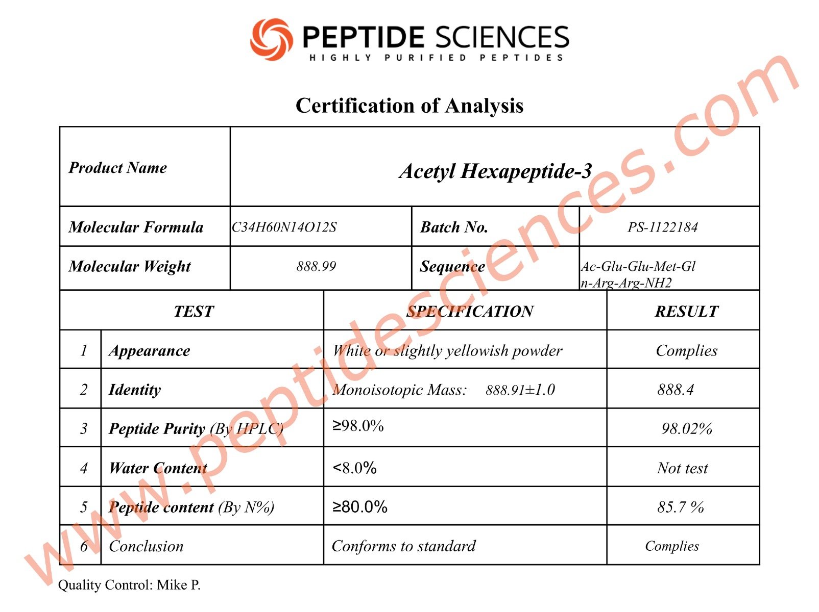 At Peptide Sciences LLC, we implement the most stringent quality control standards in the industry. From the initial synthesis to the final vacuum-sealing process, our Acetyl Hexapeptide-3 is monitored for purity and stability. Every batch is subjected to High-Performance Liquid Chromatography (HPLC) and Mass Spectrometry (MS) analysis. This ensures that when you buy Acetyl Hexapeptide-3 online, you are receiving a product with a verified sequential fingerprint, exceeding 99% purity and free from any acetate or TFA contaminants.
