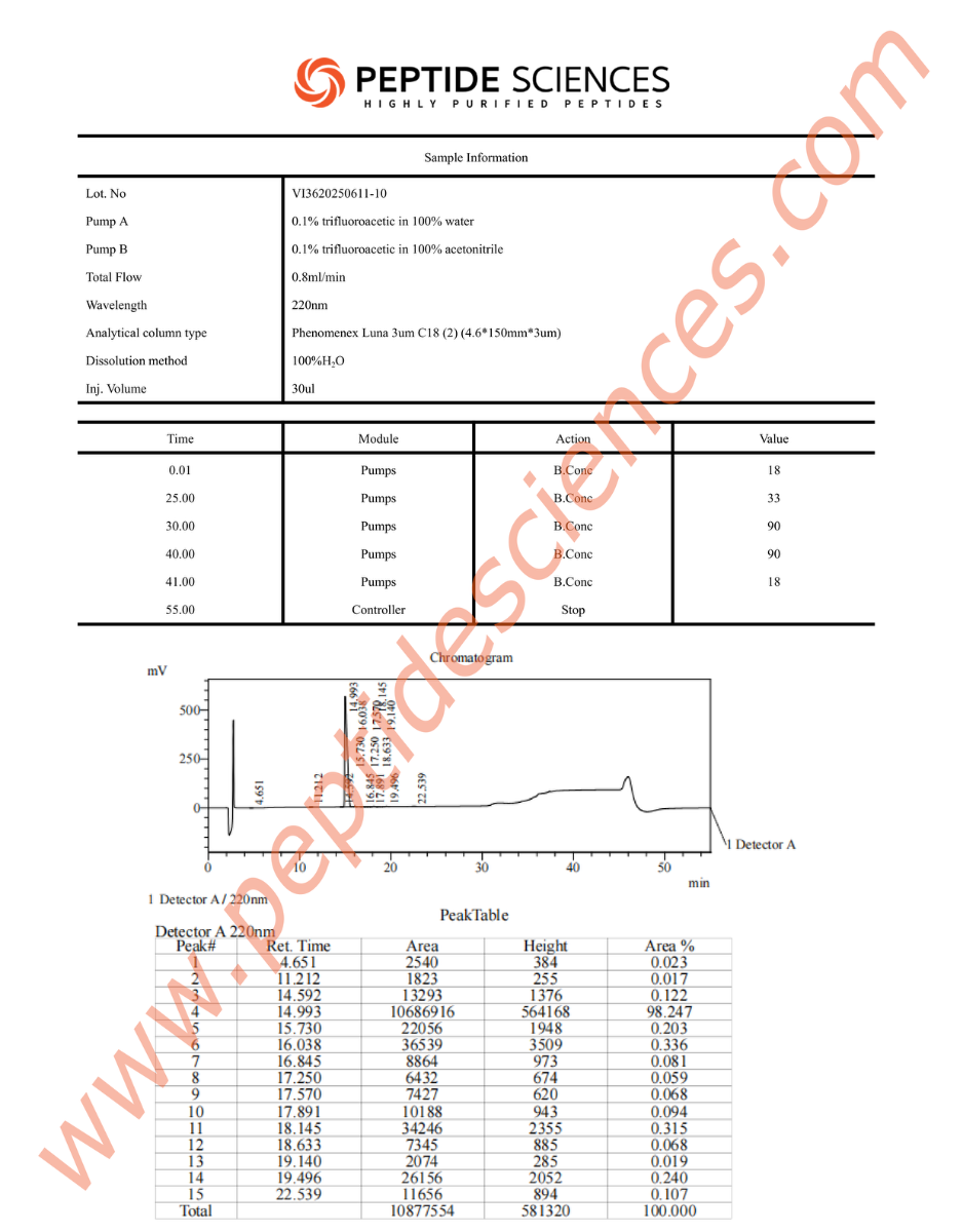 At Peptide Sciences LLC, we implement the most stringent quality control standards in the industry. From the initial synthesis to the final vacuum-sealing process, our Adipotide is monitored for purity and stability. Every batch is subjected to High-Performance Liquid Chromatography (HPLC) and Mass Spectrometry (MS) analysis. This ensures that when you buy Adipotide online, you are receiving a product with a verified sequential fingerprint, exceeding 99% purity and free from any acetate or TFA contaminants.