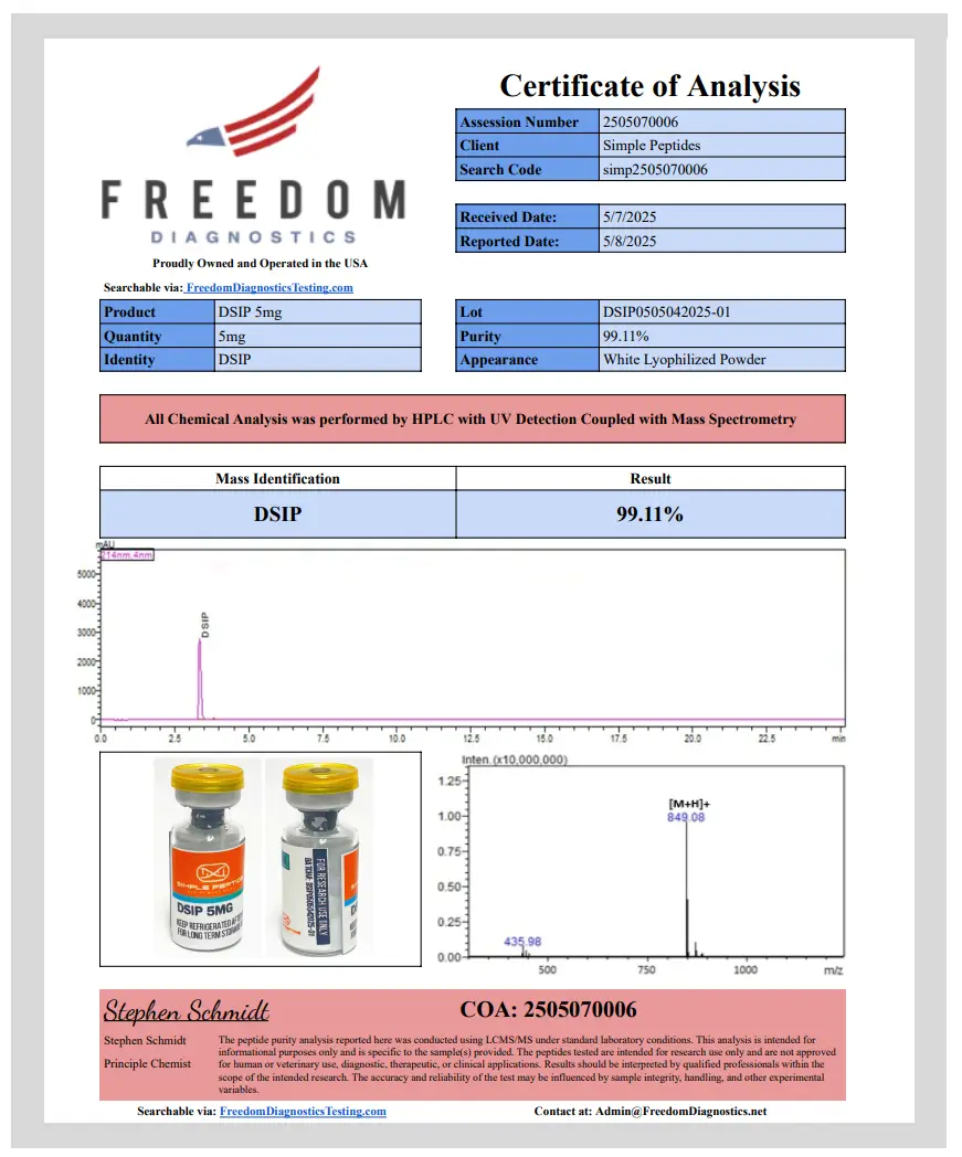 Delta Sleep Inducing Peptide (DSIP) 5MG is provided strictly for research use only. Researchers must not use this product for human or animal use, clinical purposes, diagnostic work, or consumption. Qualified professionals must conduct all research in proper laboratory settings and in line with applicable rules and guidelines.