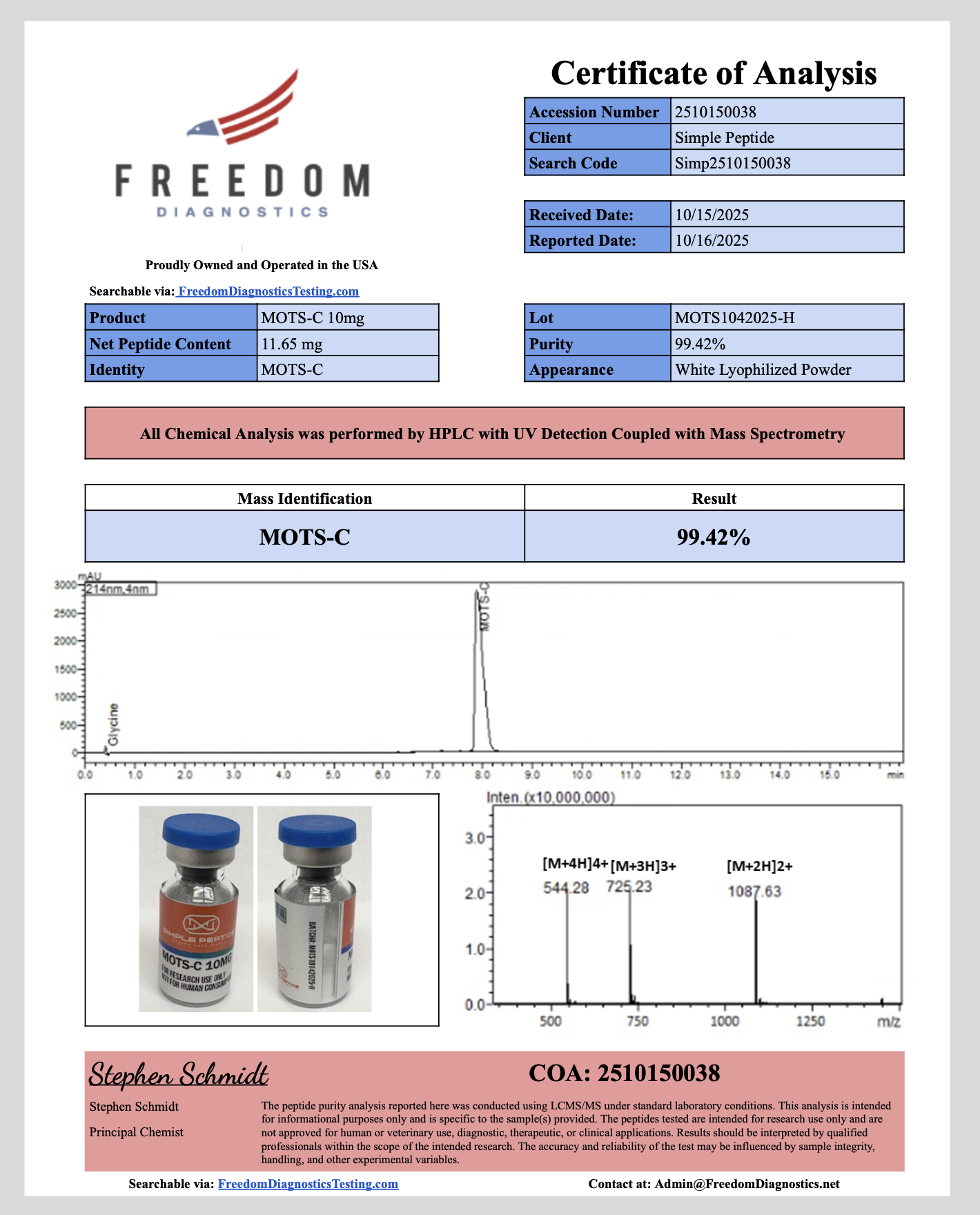 MOTS-c is provided strictly for research use only. Researchers must not use this product for human or animal use, clinical purposes, diagnostic work, or consumption. Qualified professionals must conduct all research in proper laboratory settings and in line with applicable rules and guidelines.