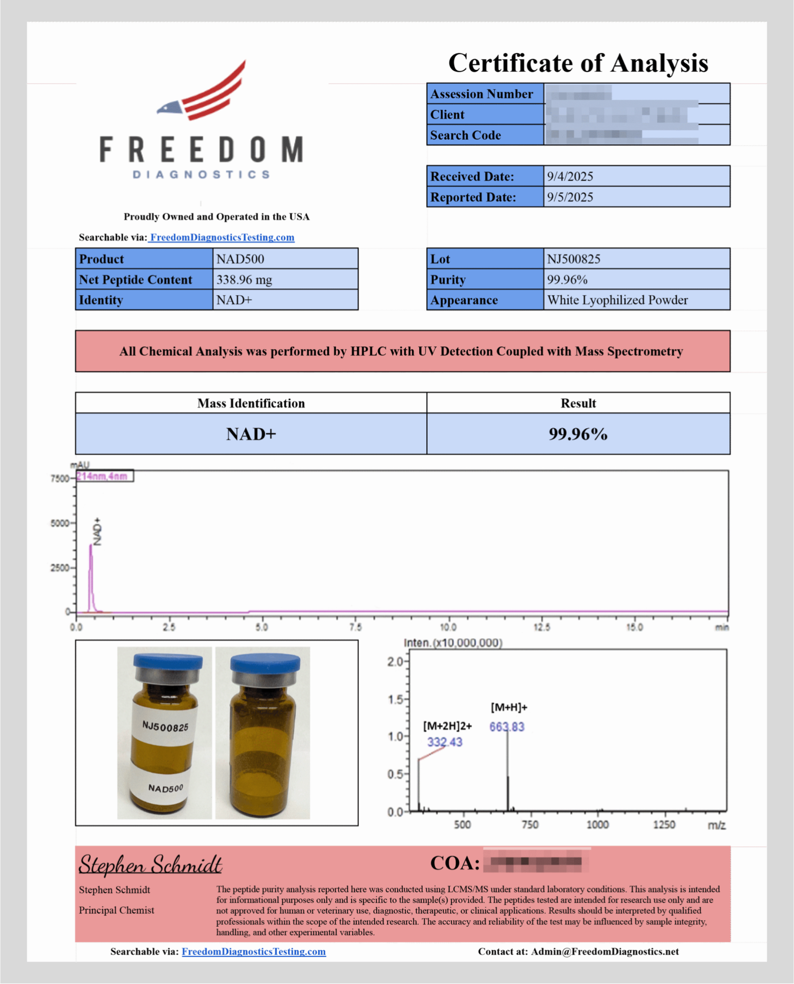 Our premium NAD+ peptide consistently meets high purity standards, with exact percentages detailed in each batch’s certificate of analysis.