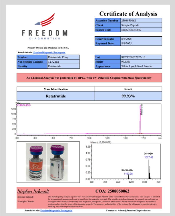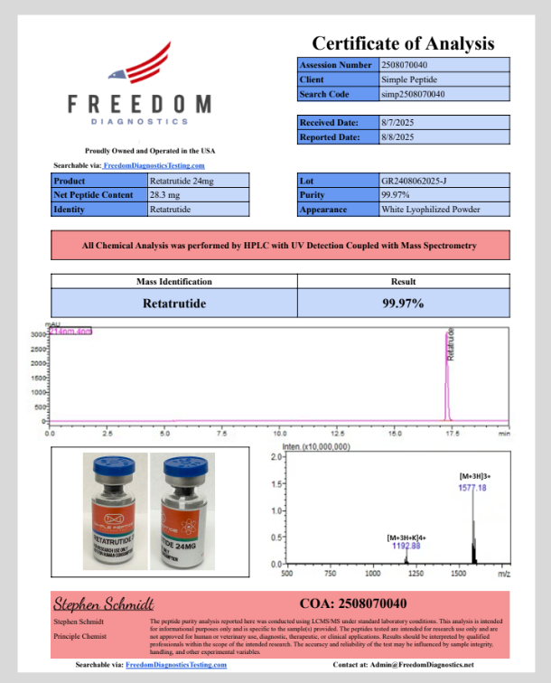 Each batch meets pharmaceutical-grade quality standards to support consistency and reliability in research supply. Independent testing and batch documentation allow researchers to review material specifications prior to use. Each shipment includes a Certificate of Analysis that supports batch verification and material transparency.